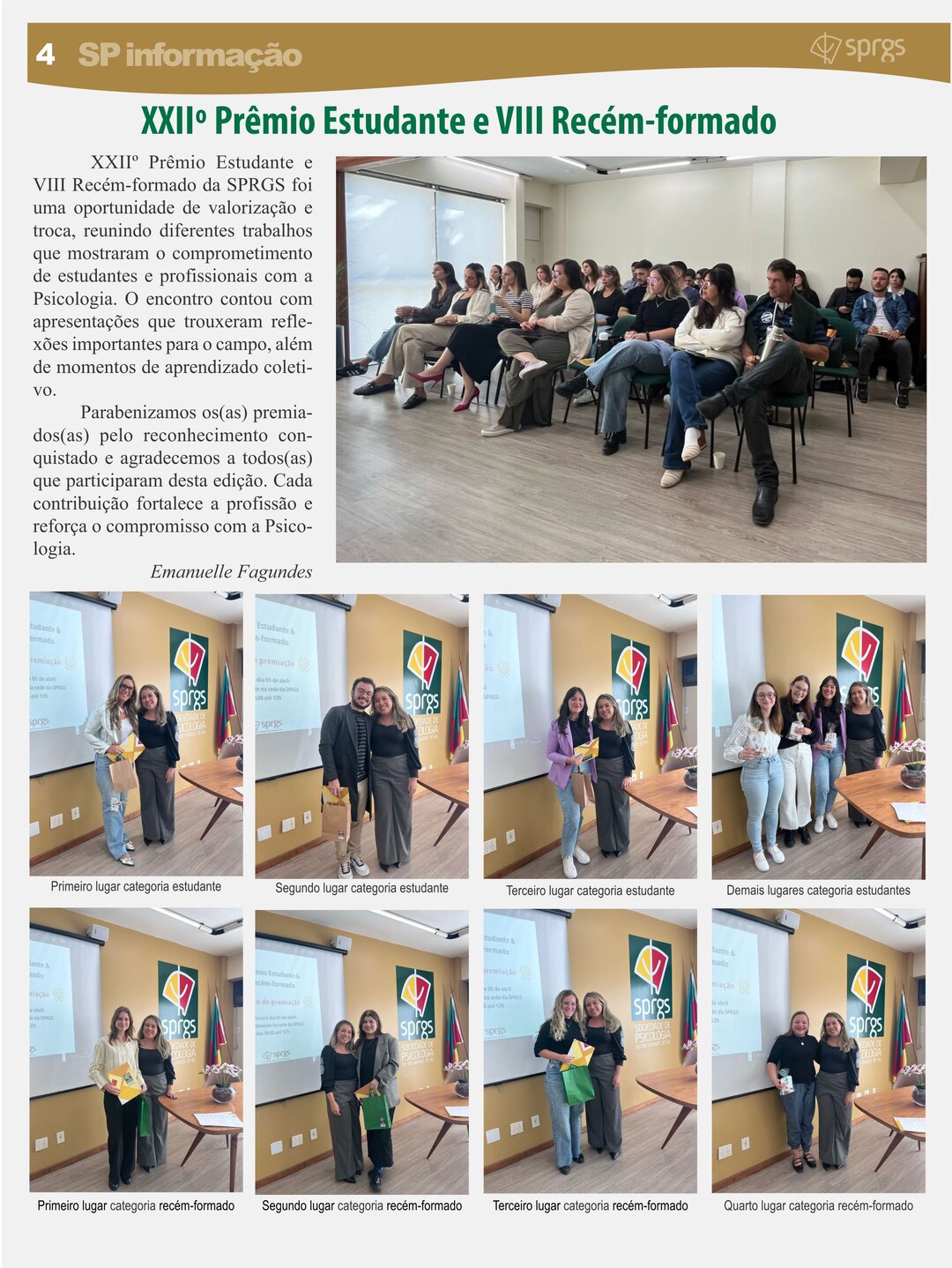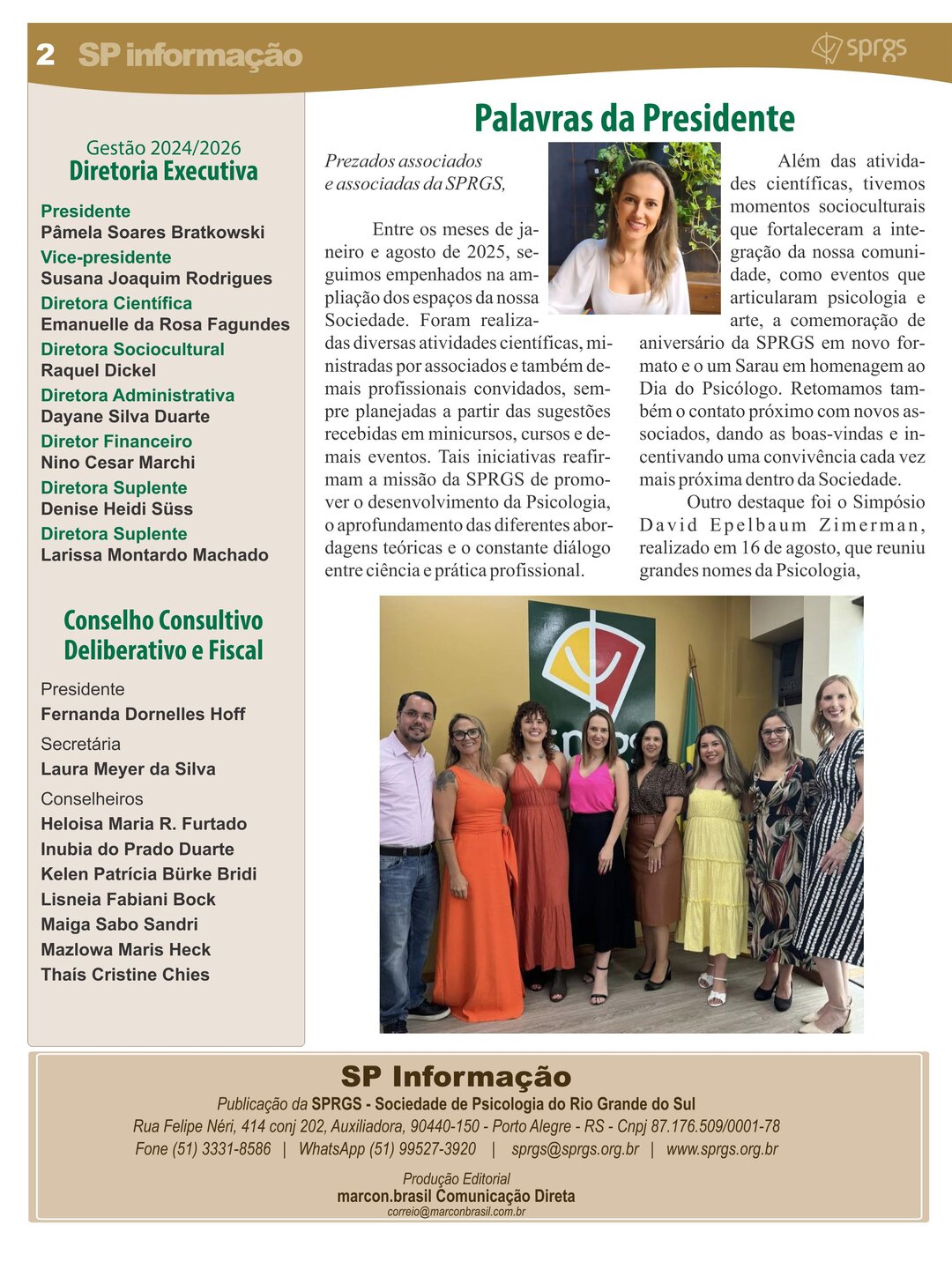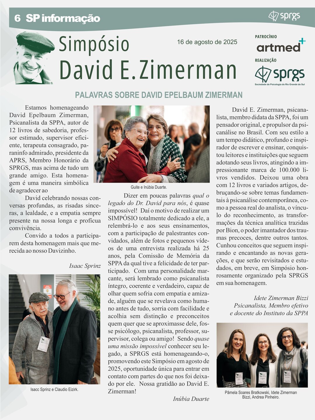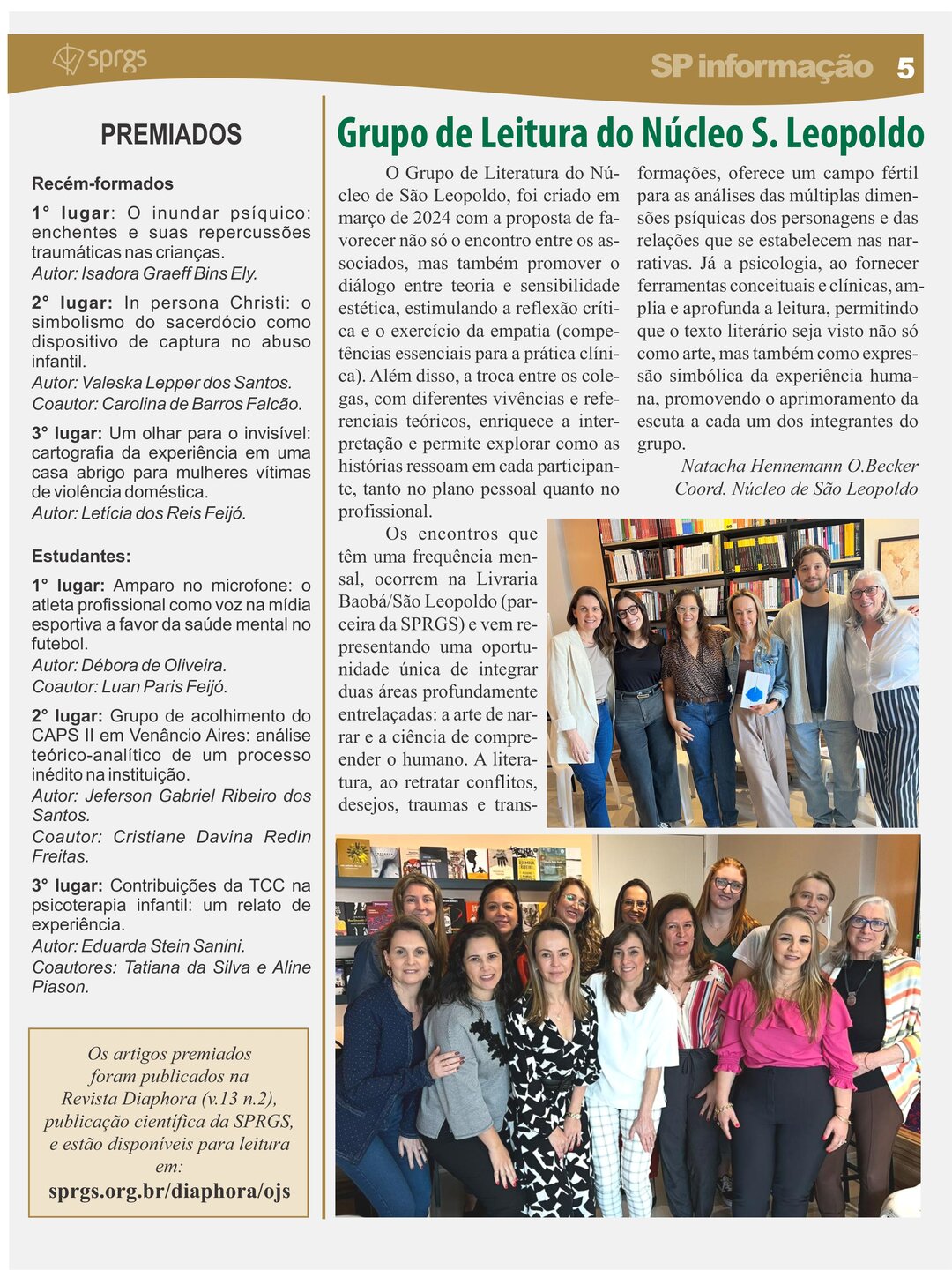 Informativo impresso com objetivo de proporcionar um canal de comunicação e disseminação de informações à comunidade de classe, por meio da publicação de artigos que resultem da divulgação de pesquisas, revisões críticas e de literatura pertinente que contribuam para o avanço do conhecimento na área, de relatos de caso, resenhas e comentários críticos a propósito de eventos culturais de interesse da categoria, bem como de notícias e informações relativas a eventos e promoções da classe e da SPRGS.