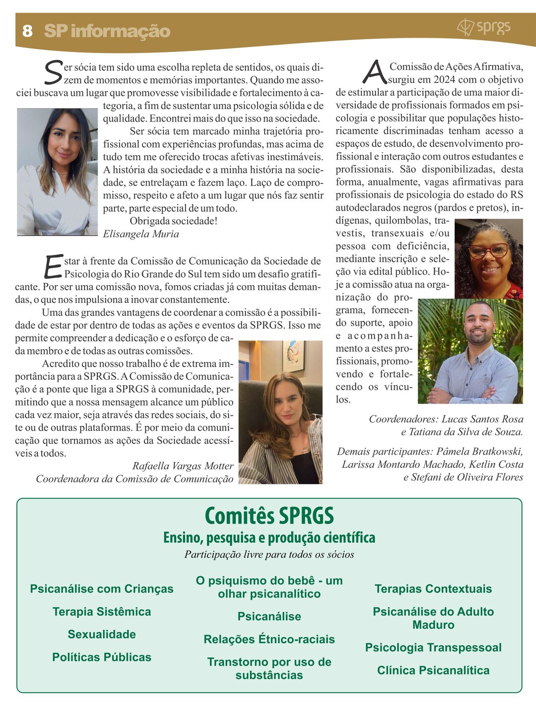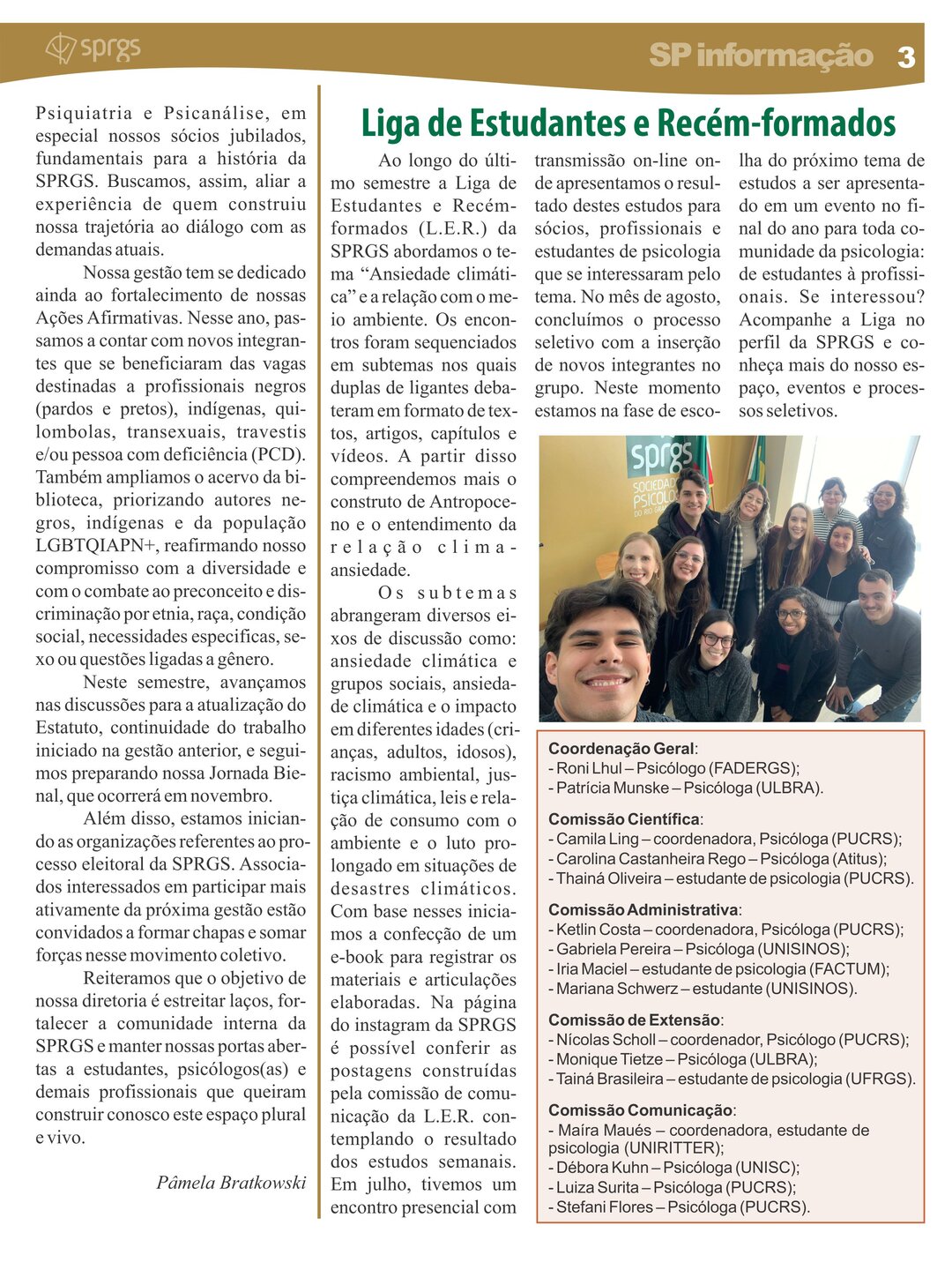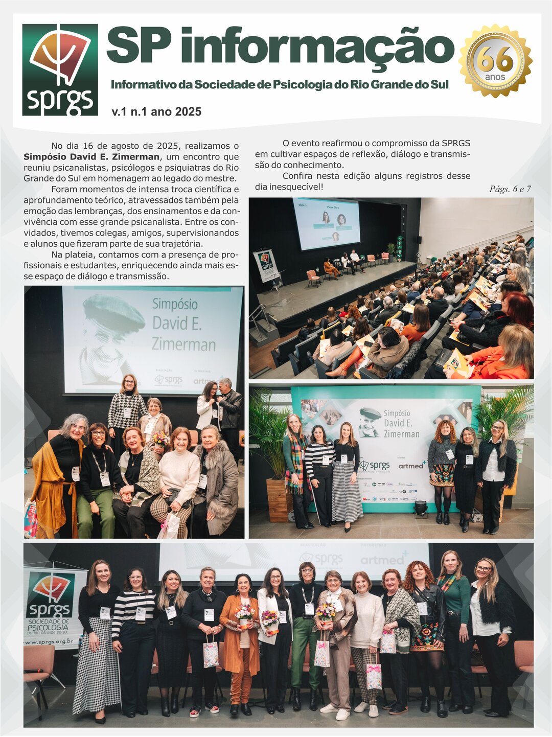 Informativo impresso com objetivo de proporcionar um canal de comunicação e disseminação de informações à comunidade de classe, por meio da publicação de artigos que resultem da divulgação de pesquisas, revisões críticas e de literatura pertinente que contribuam para o avanço do conhecimento na área, de relatos de caso, resenhas e comentários críticos a propósito de eventos culturais de interesse da categoria, bem como de notícias e informações relativas a eventos e promoções da classe e da SPRGS.